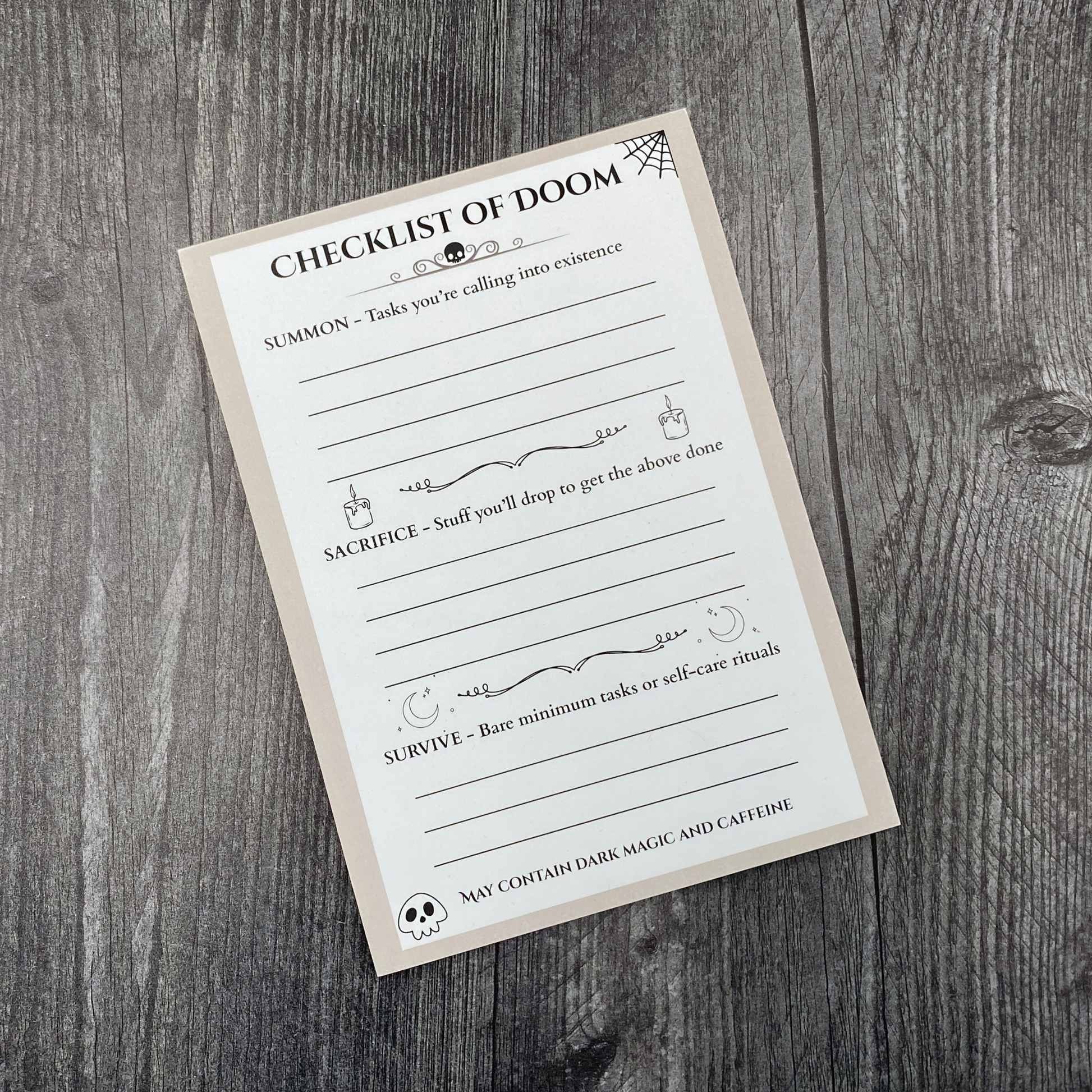 Turn your to-do list into a dramatic daily ritual with the Checklist of Doom. This 5x7 inch notepad blends spooky style with practical function, featuring three delightfully ominous sections: Summon, Sacrifice, and Survive. Whether you're conquering a mountain of errands or just trying to make it through Monday, this pad helps you organize your chaos with flair.